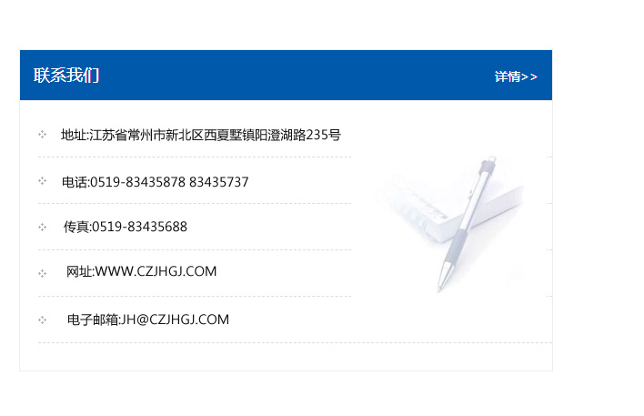 地址:常州市新北區友邦商務大廈1幢16、17層  電話:0519-85101652  傳真:0519-85112595  郵編:213022  網址:www.cz-jiayue_cn.gyhongqigg.com  郵箱:xiajifengaa@163.com